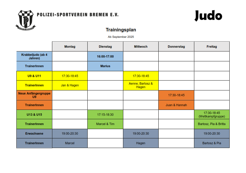 Wir bieten von montags bis freitags täglich Training für Kinder, Jugendliche und Erwachsene in allen Altersklassen an. Unsere jüngsten Mitglieder können bereits im Alter von vier Jahren in der Krabbel-Judo-Gruppe beginnen.